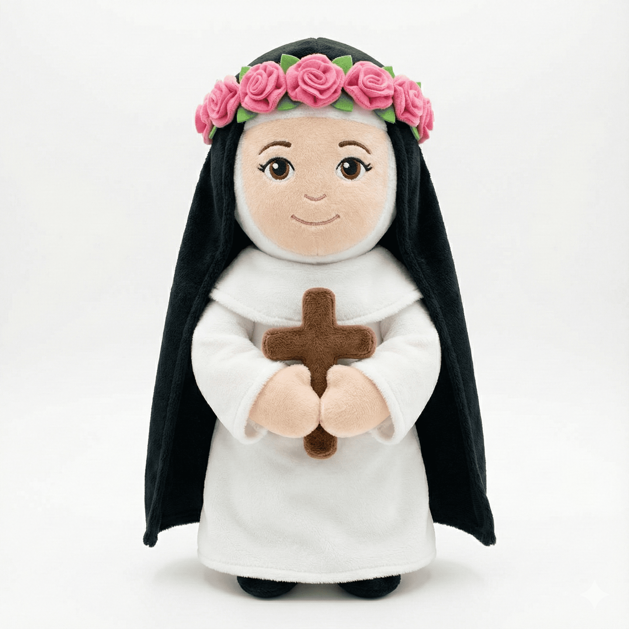 Celebra la fe y la ternura con este precioso peluche de Santa Rosa de Lima. Inspirado en la primera santa de América, este diseño captura su dulzura con su característica corona de rosas rosadas y su hábito dominico. Es la compañera perfecta para inspirar oración y devoción en los niños, recordándoles el amor a Dios y la bondad.